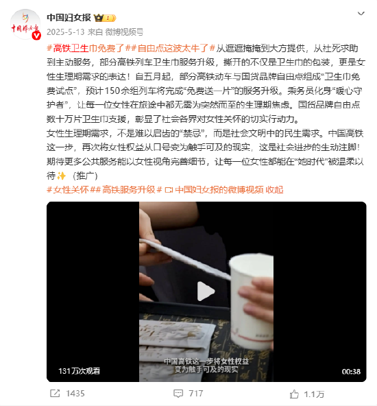2025年5月,自由点联合部分铁路部门启动“高铁卫生巾免费试点项目”,满足女性乘客应急需求。该项目获央视网、中国妇女报等媒体报道,推动公众对女性健康议题的关注,中国妇女报评论“将女性权益从口号变为触手可及的现实”。