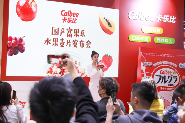展会首日下午,卡乐比国产富果乐经典原味水果麦片的发布仪式在展位中央舞台举行。这款延续了“好吃又营养,健康非油炸”经典主题的新品,凭借其独特的低温慢焙工艺,刚一亮相便吸引了大量客商驻足。