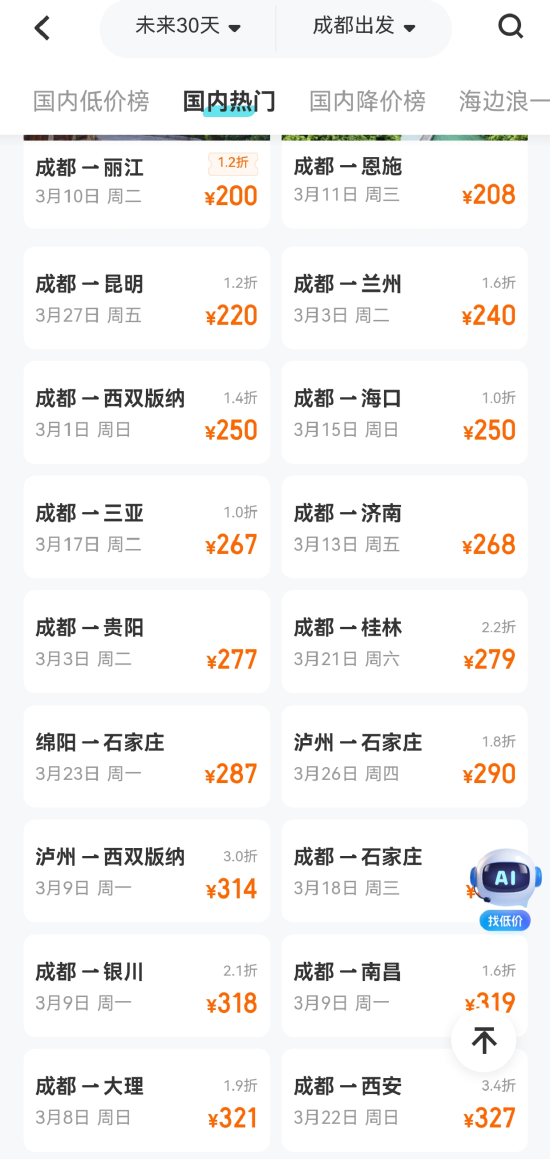 记者查询多个旅行平台,从成都出发,低价机票主要集中在3月,机票折扣最低1折。成都至恩施、昆明、三亚、海口、西双版纳、石家庄、兰州、桂林等热门旅行目的地,机票最低价格(不含税)在300元以内。其中,3月10日成都至丽江最低票价仅为200元。