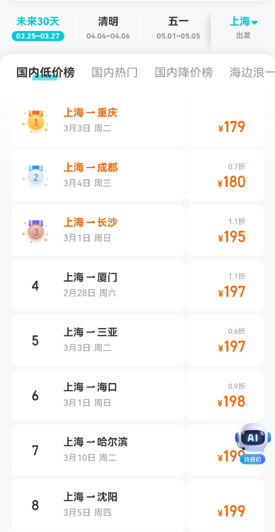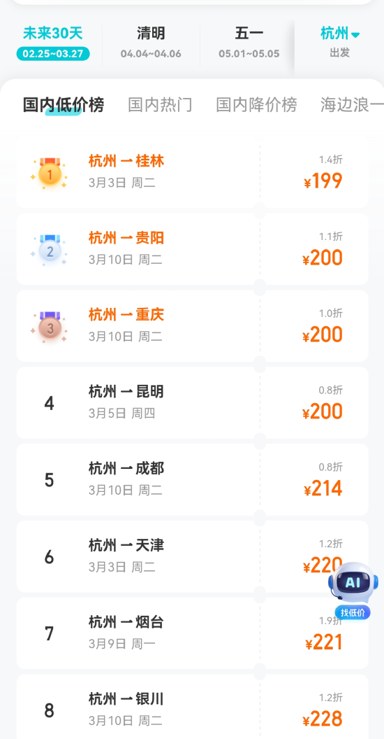 此外,未来几天,从上海、杭州、广州到来成都非常划算:上海-成都机票最低0.7折,位居上海出发低价榜第二名;杭州至成都0.8折,位居杭州出发低价榜第五名;广州至成都1.2折,位居广州出发低价榜第五名。