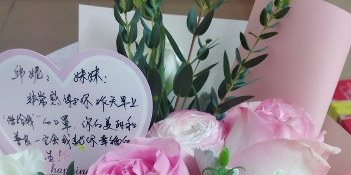 粉色的花朵和青绿色的枝条间,嵌着一张卡片,上面这样写道:“邱妮妹妹,非常感谢你昨天早上‘借给我’的口罩。你的美丽和善良一定会成就你幸福的人生。”在车站和同事帮助乘客的事做了不少,有同事还收到过乘客“放下就跑”的水果,但收到乘客的花,对邱妮来说还是第一次,“有些意外,也有些惊喜。”她边笑边说道。
