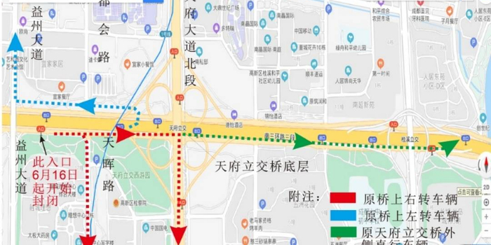 原在天府立交桥直行车辆可经辅道直行,可通过桂溪立交桥后进入主道;原在桥上左转车辆,可在天府立交桥下掉头,经内侧辅道,益州大道进城;原在桥上右转车辆,一是在天晖路提前右转,二是在天府立交桥下右转。