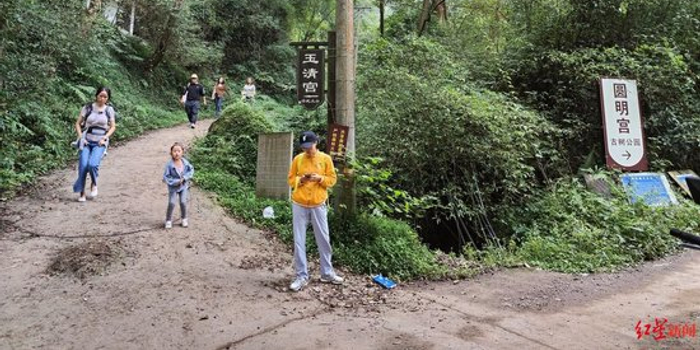 10月22日,红星新闻记者根据网友推荐的路线,来到青城山前山山脚,发现捡栗子环线的出入口设在同一个地方,游客既可以选择经圆明宫上山,在山上绕一圈之后经玉清宫下山,也可以反其道而行,整段路程有石梯,也有未经铺装的泥路,如果带着孩子,一家人走完全程需要约3个小时。