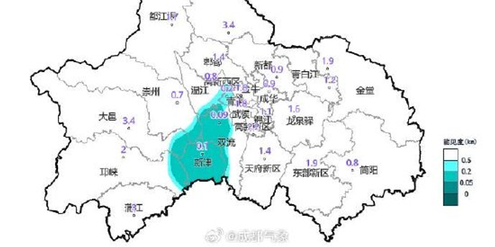 目前我市新津、双流、四川天府新区、新都、蒲江及简阳的部分地方已经出现能见度小于500米,个别地方能见度小于200米的大雾天气,预计未来3小时我市上述区市县及周边地区能见度将低于500米,个别地方低于200米,请注意防范大雾天气带来的不利影响。