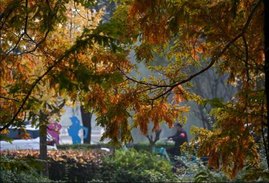 双沙东路的水杉染红沙河畔,吸引市民游客前来打卡。