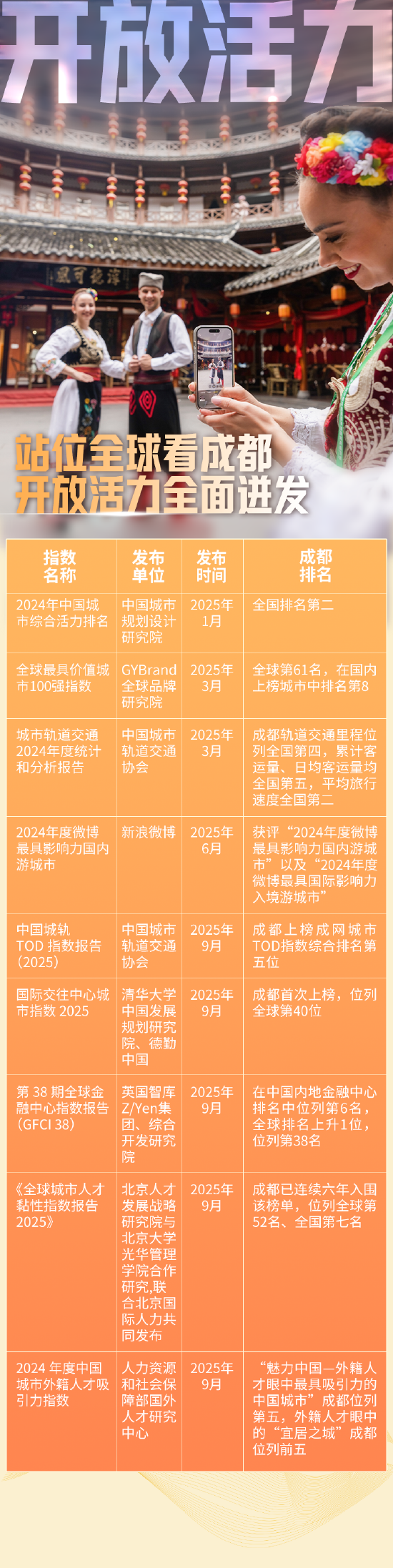 目光投向全球,成都的能级突破显著:在《全球金融中心指数报告(GFCI 38)》中位列全球第38名,金融竞争力获得国际认可;在《国际交往中心城市指数2025》中首次上榜即位列全球第40位,国际影响力稳步提升。