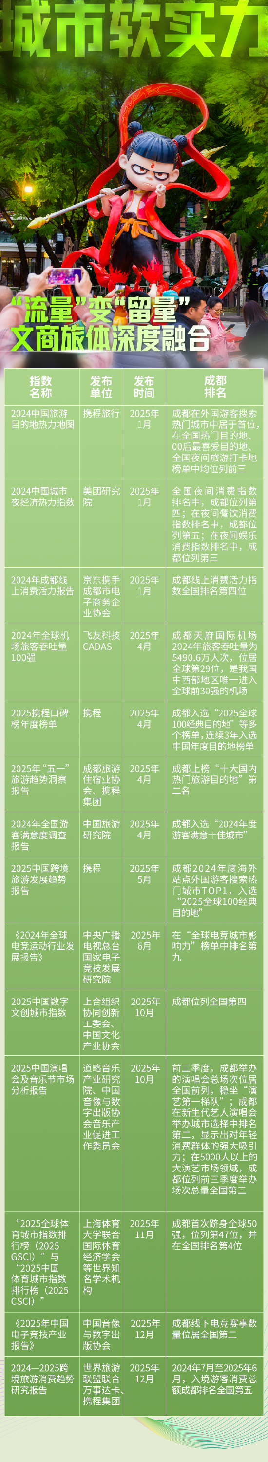 在衡量城市吸引力与生活品质的软实力榜单上,成都的表现同样亮眼。