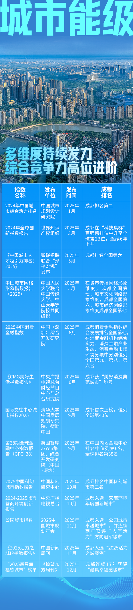 从年初到年尾,在全国乃至全球上百个权威指数、专业榜单的激烈角逐中,成都的名字高频闪现,以一系列扎实的数据与排名,勾勒出一座超大城市稳步向上的发展曲线。