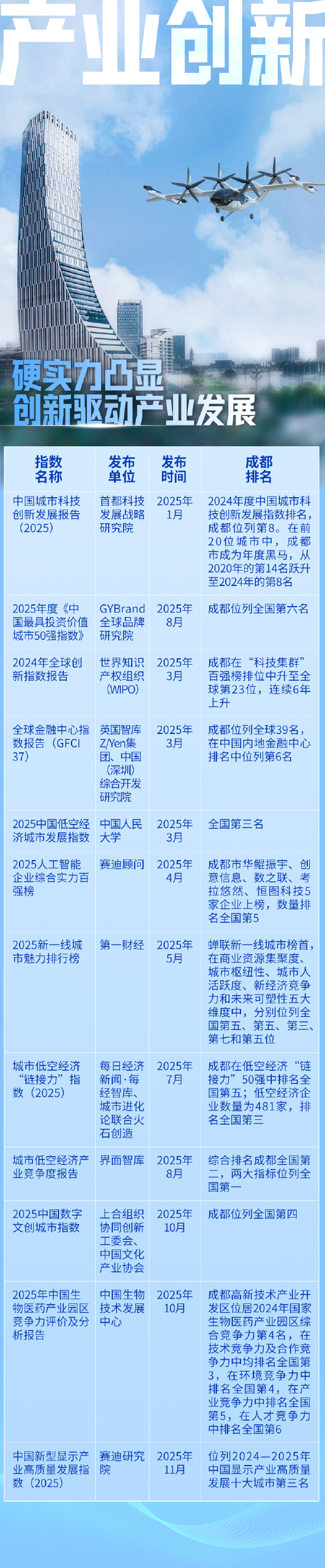 新兴产业是成都产业发展的新引擎。低空经济领域,2025年的成都表现卓越。在2025中国低空经济城市发展指数中位列全国第三;城市低空经济“链接力”指数50强中排名全国第五,低空经济企业数量达481 家,排名全国第三;城市低空经济产业竞争度综合排名全国第二,两大指标位列全国第一。