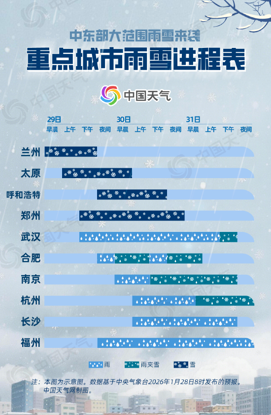 其中,降雪主要时段为29日白天至30日早晨,陕西中部、山西南部、河南西部、湖北西部等地部分地区有大雪,局地暴雪。从中国天气网推出的重点城市雨雪进程表来看,兰州、太原、郑州、呼和浩特等地将陆续迎来降雪。