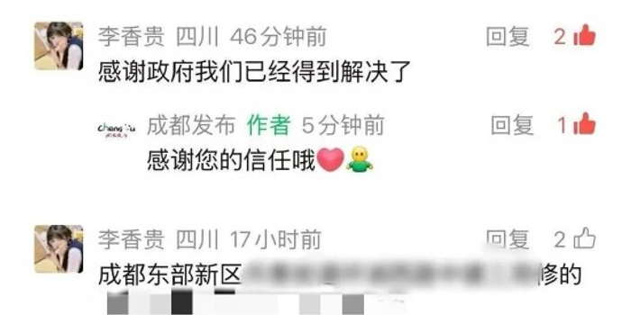 2月2日下午,李香贵也在成都发布留言区跟进了他的进展:我们(的问题)已经得到解决了。