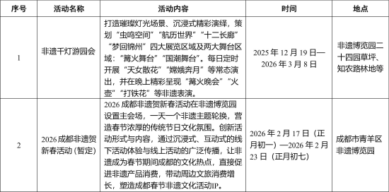 一是在文殊坊举办“了不起的非遗展”,以非遗“五朵金花”为核心呈现创新主题展陈,打造以“竹编”编织的巨型装置展陈。二是在宽窄巷子举办“宽窄里的灯火 故事里的中国”2026年宽窄光影荟,通过“光影+艺术”的形式,持续擦亮“艺术进院落”“艺术进街巷”等活动IP。三是在非遗博览园举办“蓉城囍事”百年好合系列活动,邀请10年以上婚龄夫妇参与非遗手作体验,为美好婚姻赋予更深厚、更温暖的文化记忆。