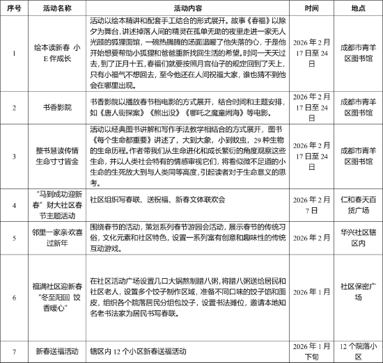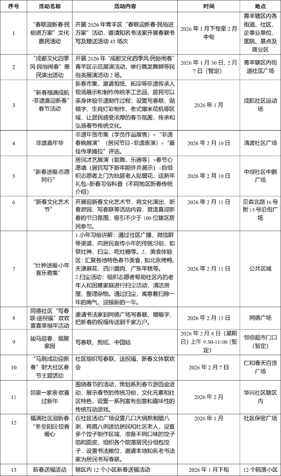 一是开展“成都文化四季风·民俗闹春”惠民演出活动,于2月7日在辖区内街道社区广场开展示范展演活动,精心策划舞龙、舞狮等民俗表演,营造新年气氛。二是在辖区内各街道、社区、企事业单位、医院、景点及商业区开展2026年青羊区“春联迎新春·民俗进万家”活动,邀请知名书法家开展春联书写及赠送活动45场次。