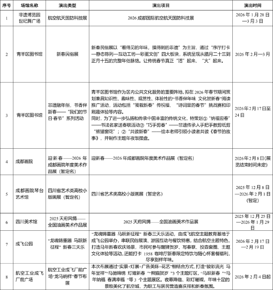 一是区图书馆推出“绘本读新春·小E伴成长”读书活动,开设播放春节档电影的“书香影院”,并开展“整书慧读传情·生命寸寸皆金”活动。二是在航空工业成飞厂前广场组织“龙马纳祥”灯会,打造“骏彩流光·马年呈祥”“马驰锦绣·灯耀新春”“熊猫贺岁”3个主题灯区。三是大年初一至初三,在成飞公园举办“龙魂铸重器·马跃新征程”新春三天乐,串联民俗展演、游园互动与餐饮特惠,结合航空主题特色,打造马年新春欢庆场景。