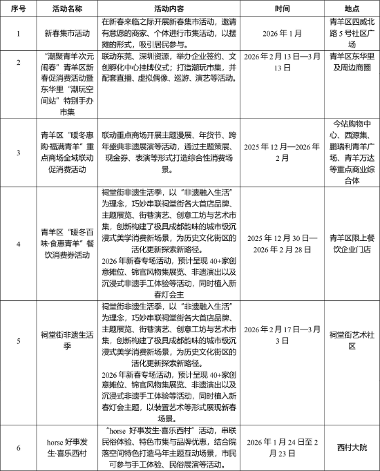 一是祠堂街举办非遗生活季,以“非遗融入生活”为理念,打造40余家创意摊位,创新构建极具成都韵味的城市级沉浸式美学消费新场景。二是“horse·好事发生·喜乐西村”活动,串联民俗体验、特色市集与品牌优惠,结合院落空间特色打造马年主题互动场景。