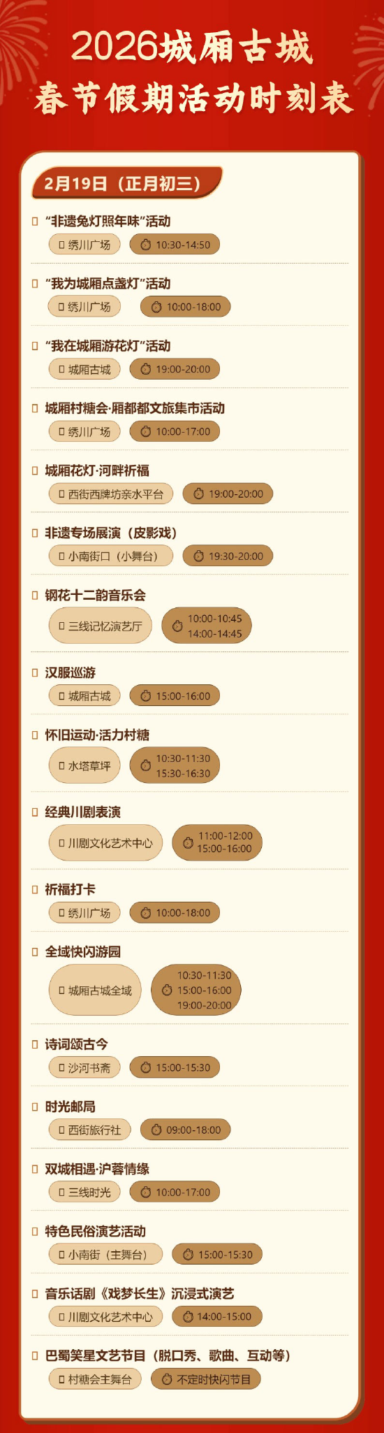 2月19日(正月初三)19:30-20:00,小南街口小舞台上演非遗皮影戏专场展演,沉浸式感受传统老手艺的独特魅力;
