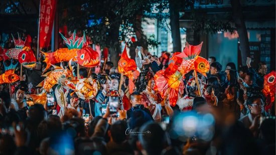 手持大鱼灯的巡游队伍缓缓走过街巷