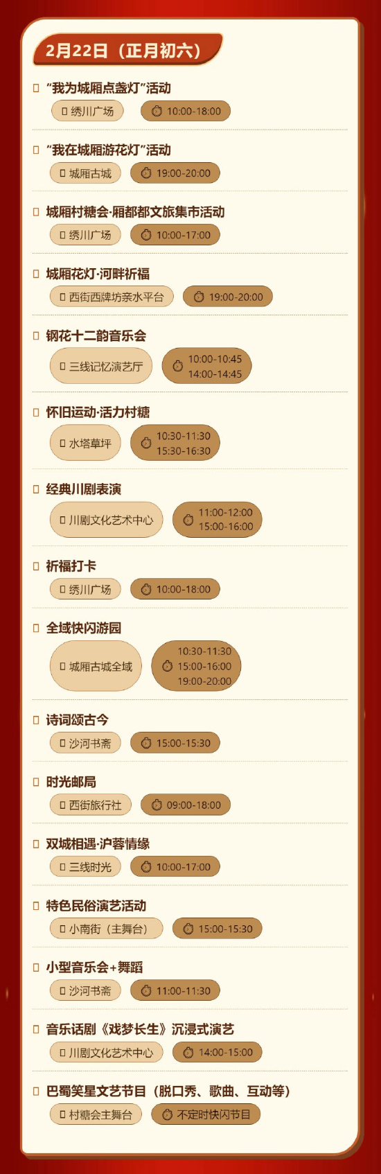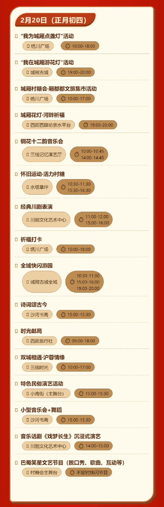 还有绣川广场的祈福打卡、西街旅行社的时光邮局、三线时光的双城相遇・沪蓉情缘,多个打卡点邀您定格新春美好,更添新春热闹。