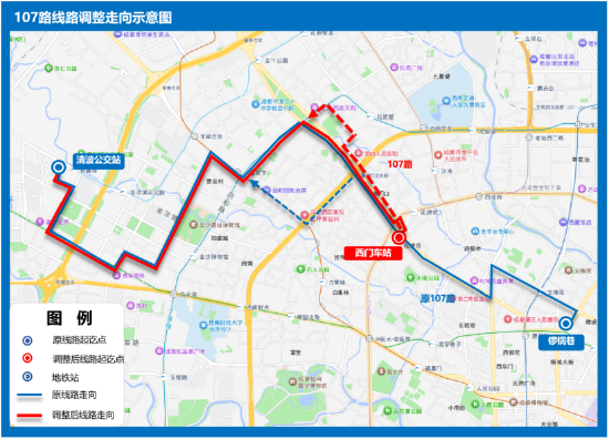 线路走向:清波公交站发出,清波公交站至五里村行驶路线及站点不变,调整经金牛大道营门口路、一环路北一段、乡农市街、花牌坊街后到达西门车站(终点站);