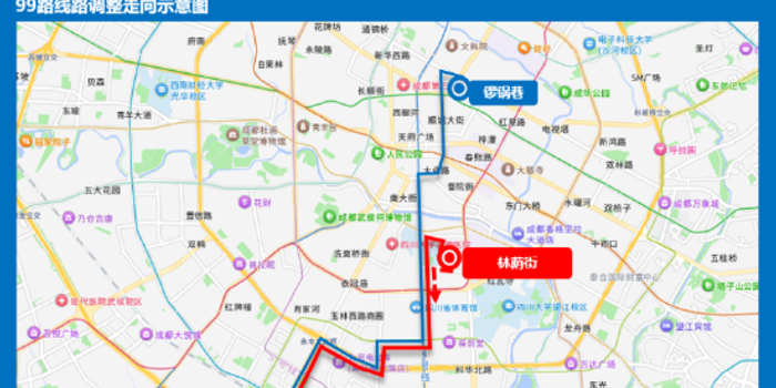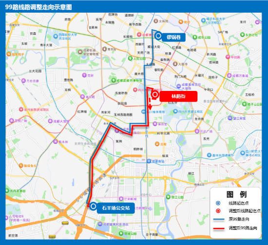 站点设置:取消华西坝、锦江宾馆、大业路、盐市口、顺城大街南、市青少年宫、锣锅巷、华西第二、第四医院(返程);增设华西坝(去程)、大学路(去程)、林荫东街(去程)、林荫街。