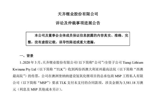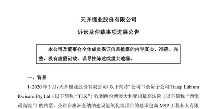 3月11日,天齐锂业股份有限公司发布公告,披露了澳洲奎纳纳建设氢氧化锂项目总承包商MSP工程私人有限公司对其全资子公司TLK提起的诉讼的最新进展。这是天齐锂业对该财务纠纷的首次公开回应。