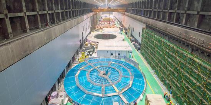 在白鹤滩左右岸的地下厂房中,各布置了8台单机容量为100万千瓦的水轮发电机。这个单机容量,达到了目前的世界之最。每一台百万水电机组,高度超过50米,重量超过8000吨——一台机组就相当于一艘驱逐舰的重量,或一座埃菲尔铁塔所用金属的重量。一共要容纳下16台这样的庞然大物,相应地就要有非常巨大的厂房。