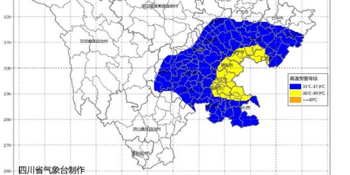 7月20日16时,四川省气象台发布高温蓝色预警:21日到24日,广安、南充、遂宁、资阳、内江、自贡、宜宾、泸州8市和绵阳、德阳、成都、雅安、眉山、乐山6市东部,达州市南部,部分地方日最高气温可达35℃或以上,局部地方将超过38℃。