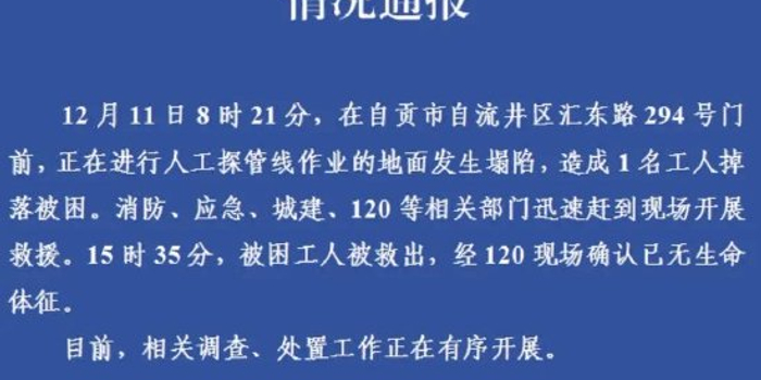 当晚,四川自贡高新区城市建设和管理执法局发布通报:12月11日8时21分,在自贡市自流井区汇东路294号门前,正在进行人工探管线作业的地面发生塌陷,造成1名工人掉落被困。消防、应急、城建、120等相关部门迅速赶到现场开展救援。15时35分,被困工人被救出,经120现场确认已无生命体征。目前,相关调查、处置工作正在有序开展。