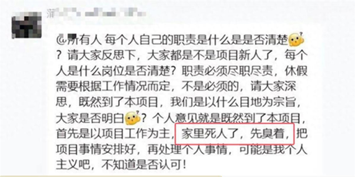红星新闻记者发现,在这张微信群聊天截图中,名为蒲某江的工程项目领导@所有人,然后发布了一段文字:每个人自己的职责是什么是否清楚?请大家反思下,大家都是不是项目新人了,每个人是什么岗位是否清楚?之后要求下属必须尽职尽责,休假需要根据工作情况而定,不是必须的,个人意见就是既然到了本项目,首先是以项目工作为主,家里死人了,先臭着,把项目事情安排好,再处理个人事情,可能是我个人主义吧,不知道是否认可!