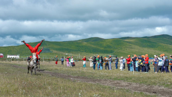 8月22日,红原县大草原上热闹非凡,牧民们表演着红原县本地的民族马术,也是省级非遗代表性项目,骑手时而叠罗汉,时而马背上射箭,展示着藏族骑手奔放豪迈的风采,迎来了现场阵阵欢呼和掌声。