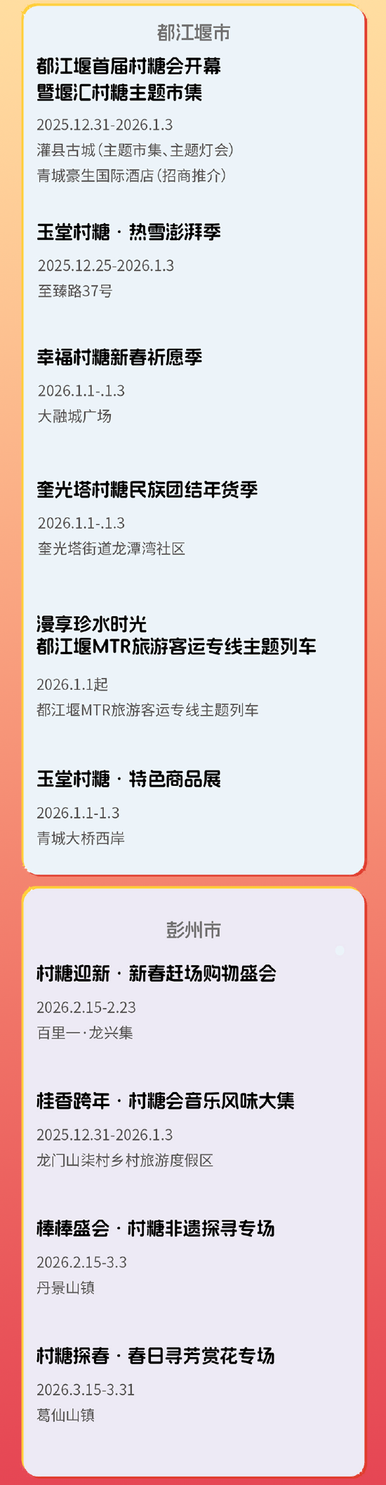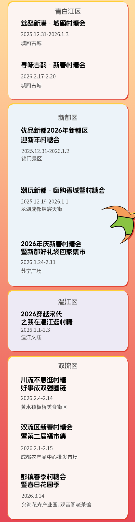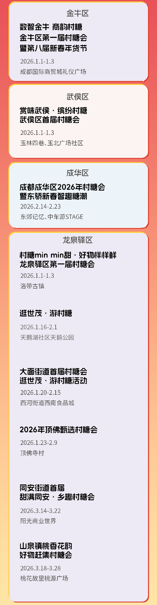春节期间的活动同样精彩,邛崃市将举办“邛崃市村糖会暨平乐中国年”活动,地点位于平乐古镇景区;彭州市将举办“村糖迎新·新春赶场购物盛会”,地点位于百里一·龙兴集;成华区将举办“成都成华区2026年村糖会暨东骄新春智趣糖潮”活动,地点位于东郊记忆、中车源STAGE。