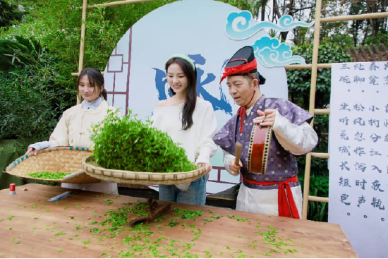 伴随着《采茶号子》视频的播出,蒙顶山茶区骑龙场、牛碾坪等核心产区的春采盛况首次在成都市人民公园“云端”呈现——茶农们背着茶篓穿梭茶垄,茶叶交易市场人头攒动,一幅生动的春茶丰收图景跃然眼前。随后,名山区领导登台击鼓,鼓声震天,正式宣告2026年第一背篓茶上市!这一传承千年的仪式,不仅象征着春茶的开采,更承载着蒙顶山茶从西汉吴理真首开人工植茶先河,到唐代列为皇家贡茶、持续进贡1169年的厚重历史,以及当代茶人的匠心传承。
