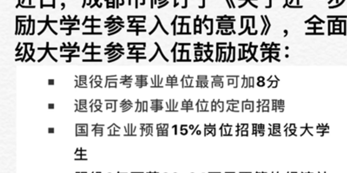 近日,成都市修订了《关于进一步鼓励大学生参军入伍的意见》,全面升级大学生参军入伍鼓励政策。包括退役后考事业单位最高可加8分,退役可参加事业单位的定向招聘,国有企业预留15%岗位招聘退役大学生,服役2年可获20-24万元不等的经济补助,回蓉应征期间报路费、发生活补贴等。意见明确,从成都市参军入伍的普通全日制高等学校大学生,按照本科毕业生5万元,大专毕业生4万元,本科新生和在校生3万元,大专新生和在校