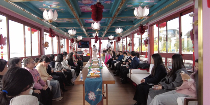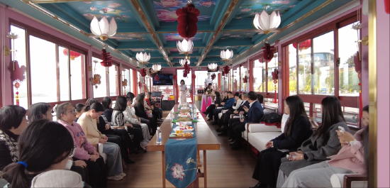 船舱内,活动精彩纷呈。大家品尝着遂宁特色小吃与茶水点心,耳畔传来悠扬的古筝与琵琶演奏,清音表演更是让人沉浸于传统文化的独特韵味之中。为进一步活跃气氛,活动还精心安排了家风家教知识问答、趣味猜谜、歌曲大PK等互动环节。女职工们踊跃参与,在欢声笑语中赢取了精美奖品,现场氛围温馨而热烈。活动尾声,为每一位女职工送上饱含节日祝福的鲜花,把组织的关怀与温暖送到女职工心坎上。