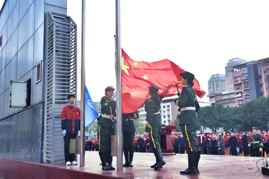 典礼在庄严的升旗仪式中拉开序幕。伴随着雄壮激昂的国歌,鲜艳的五星红旗冉冉升起、迎风飘扬。随后,承载着学校精神与荣耀的校旗,在悠扬的校歌声中徐徐升起。全场师生肃立注目,心怀对祖国的赤诚热爱,满怀对学校的自豪与荣光。