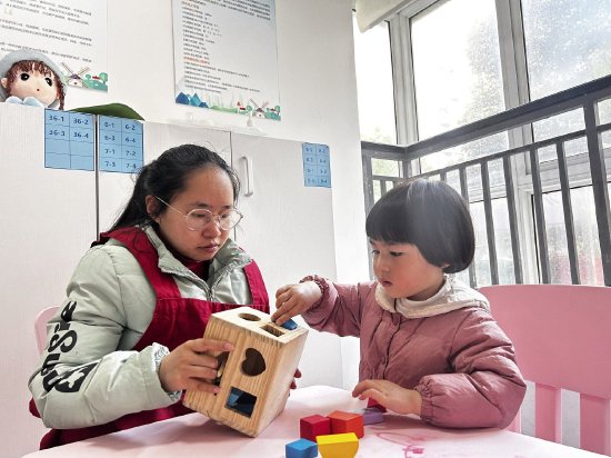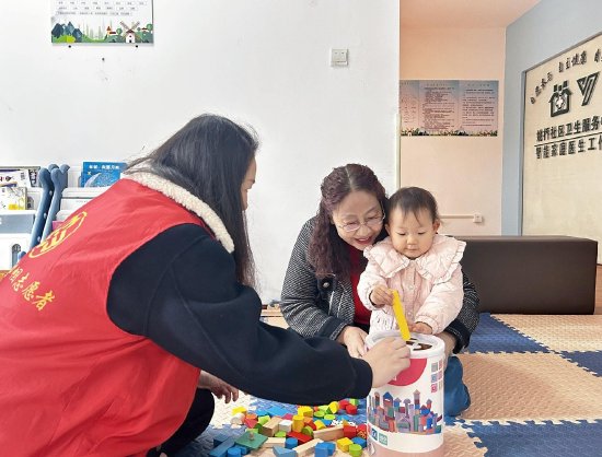 走进雅安市雨城区青江街道土桥社区的儿童友好公益服务站点,家长正带着孩子一起玩玩具。“这个是什么形状呀?要放进哪个洞?”一位老人拿起一块三角形的木块,引导孩子将木块通过圆桶盖子上的三角形洞放进桶里。圆桶的盖子上有各种形状的孔洞,小孩拿着木块试了几次,最终顺利找到适配的三角形孔洞,将木块放了进去。“宝宝找对了,真不错。”随后,老人发出肯定的赞赏。