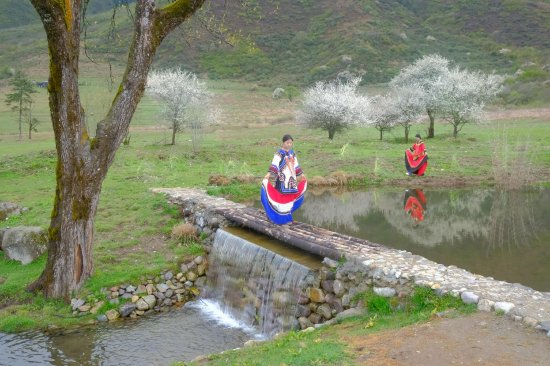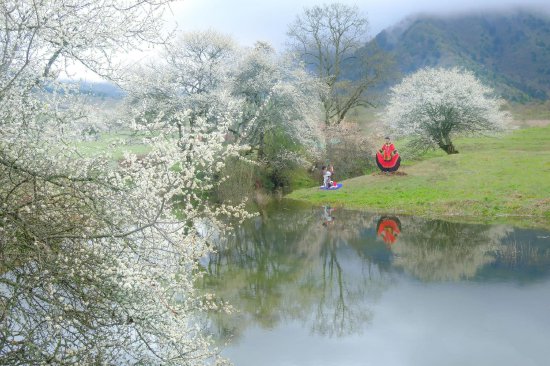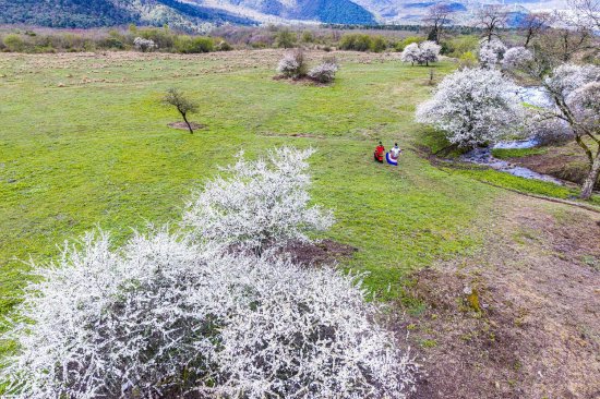 风是这场“野李之雪”的信使。它从孔明南征的古道吹来,穿过烽火台残存的石壁,掠过传说中孟获屯兵的铁寨子,带着历史的低语,轻轻摇晃枝丫。于是,细碎的花瓣如雪沫般簌簌飘落,不是凋零,更像是一场温柔的告别。它们拂过彝家姑娘的百褶裙,沾上黝黑的发梢,落在破土的嫩草上,为绿毯缀上碎玉;或飘向澄澈的溪流,随波逐流成灵动的月光;偶有几片落在红石滩上,与暗红色的岩石相映,红白交织间,竟生出几分柔情。阳光穿透花丛,在地面投下斑驳光影,花香与草木的清香交织,沁人心脾。凑近细嗅,那香气清甜中带着一丝若有若无的醉意,如同彝家篝火的歌谣,质朴中藏着古老的故事。