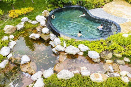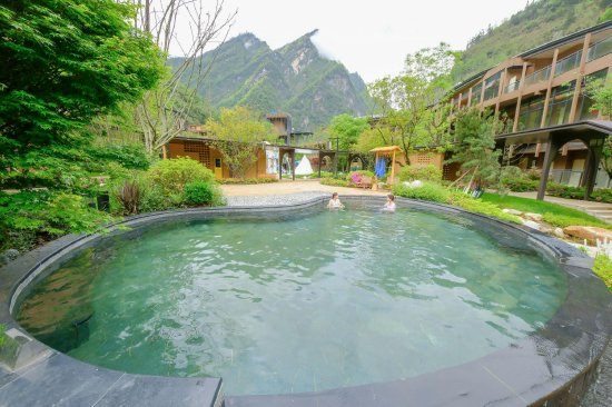 这些小池,不似大泳池那般张扬,它们小巧、精致,充满了私密的温情。池水引自周围的泉眼,药香轻飘,触手温润。水温适中,恰到好处地包裹着身体,既不烫得让人退缩,也不凉得让人瑟瑟。这是一种高品质的馈赠,富含的矿物质在无声中滋养着肌肤,仿佛大地母亲温柔的爱抚。坐在池中,抬头便是蓝天白云,侧耳可闻鸟鸣虫吟,鼻尖萦绕着草木的清香。温热的泉水与微凉的山风交织,构成了一种难以言喻的舒适,让人恍若置身世外桃源,忘却了时间的流逝。